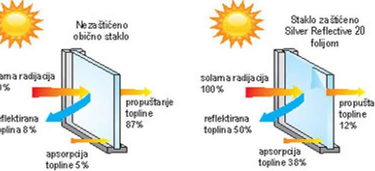 Folija za prozore,stop-sol,protiv sunca i UV zracenja,koja leti smanjuje temperaturu u prostoru i do 14C,a pritom cuva privatnost sa spoljne strane “ogledalo efektom”,dok se spoljna okolina sa unutrašnje strane normalno vidi.
