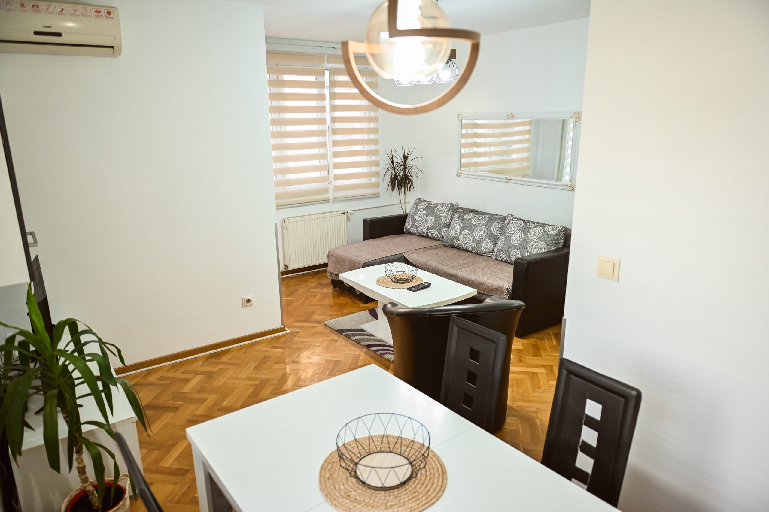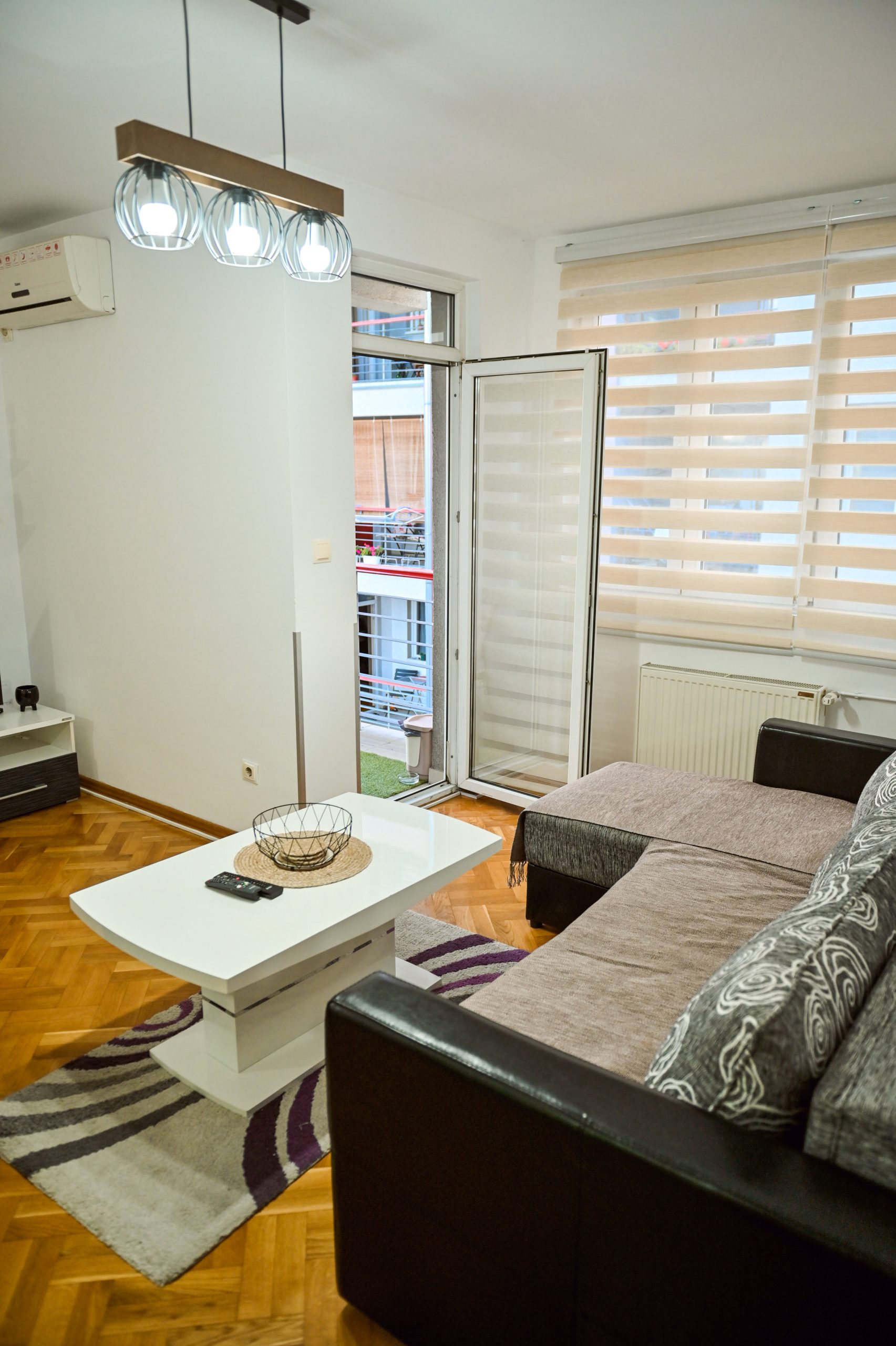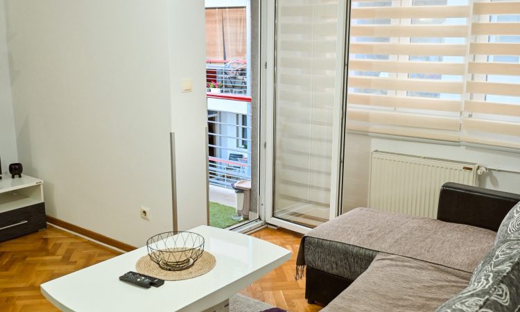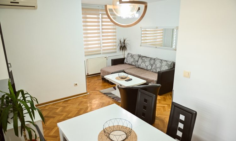 Stan je kompletno namešten i opremljen kvalitetnim nameštajem i uređajima, sastoji se od dnevne sobe sa trpezarijom i kuhinjom, spavaće sobe, toaleta i terase, sa centralnim grejanjem i klima uređajem.